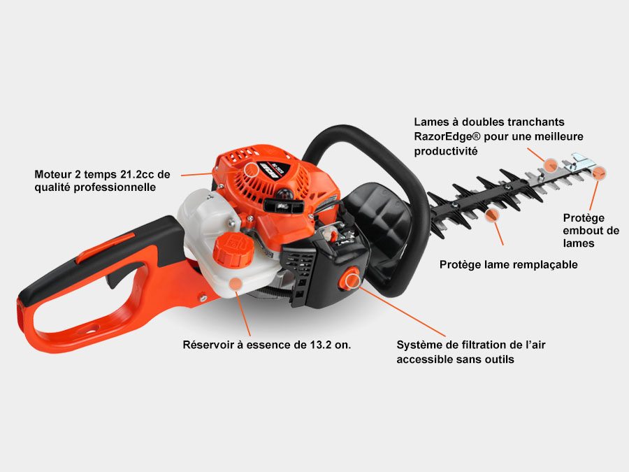 Cylindrée du moteur (cm³) 21.2 Système de démarrage i-30™ Capacité de carburant (fl. oz.) 13.2 Réservoir de carburant transparent Standard Longueur de la lame (po) 20 Type de coupeur Double face et double réciprocité Poids à sec (lb) 10 Garantie 5 ans consommateurs / 2 ans commerciaux